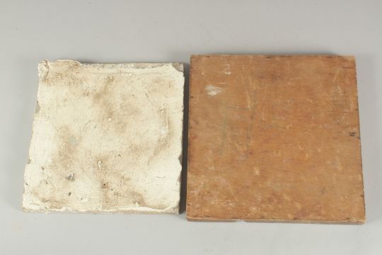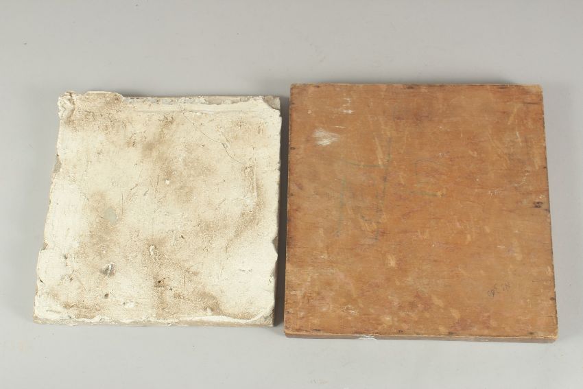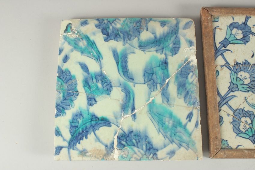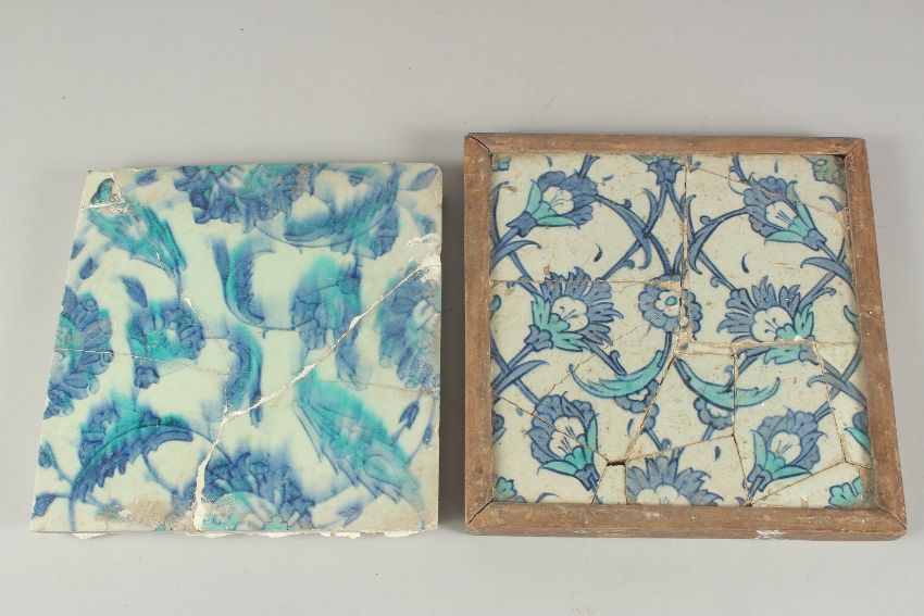 TWO EARLY 17TH CENTURY OTTOMAN IZNIK BLUE AND WHITE GLAZED POTTERY TILES, each approx. 25cm square (af).