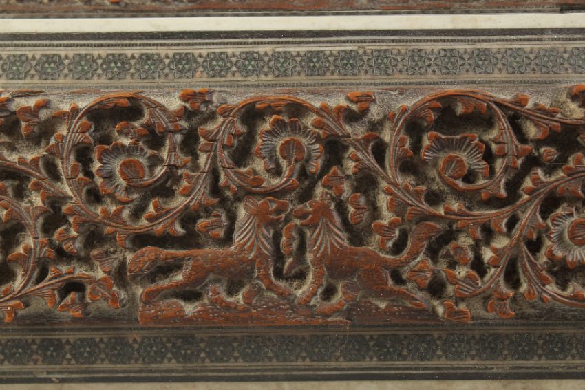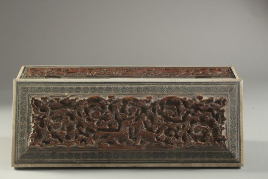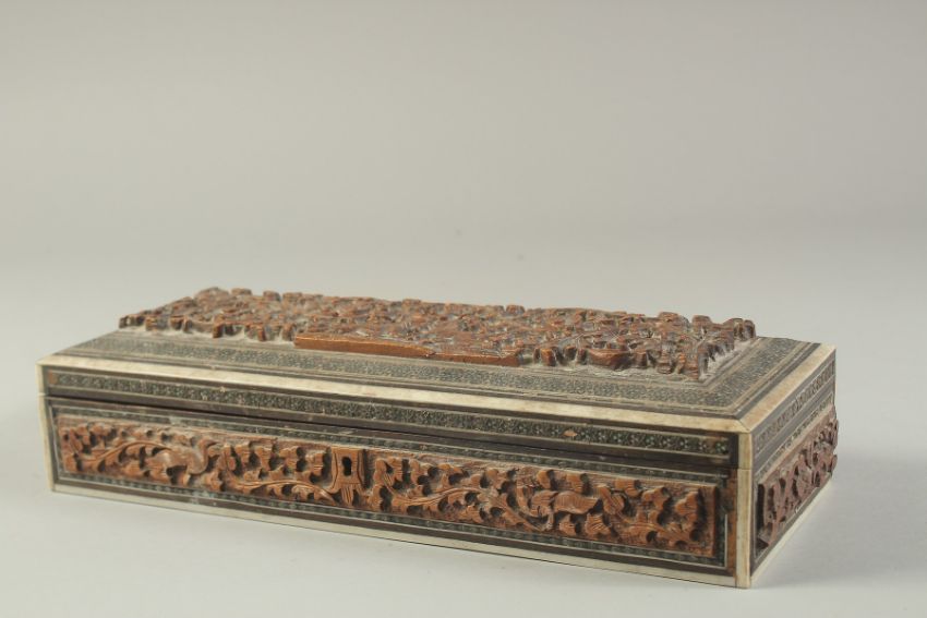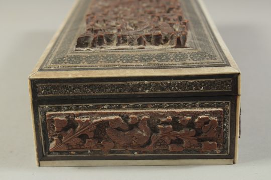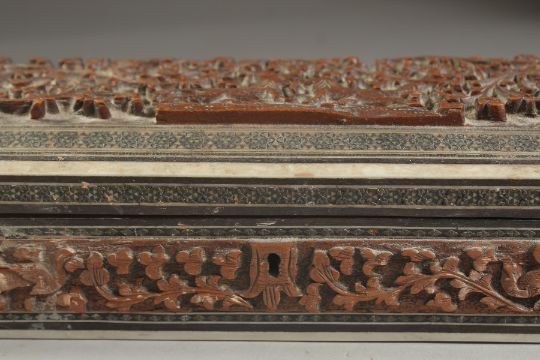 A 19TH CENTURY ANGLO INDIAN BONE INLAID CARVED WOODEN BOX, 29cm long.