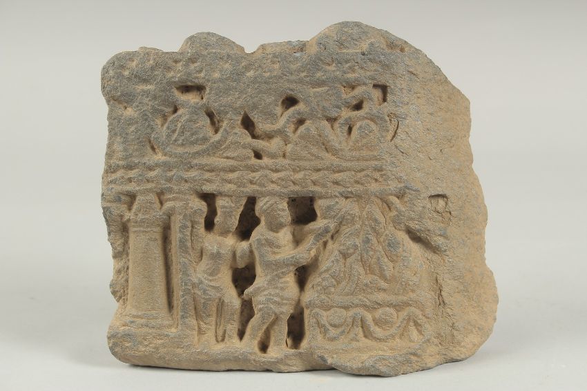 A RARE GANDHARA CARVED GREY SCHIST STONE TILE FRAGMENT, depicting two men around a ceremonial fire, 17cm x 15cm.