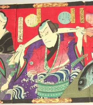 KUNICHIKA TOYOHARA (1835-1900): KABUKI THEATRE PLAY; a late 19th century original Japanese woodblock print, triptych (3 pieces).