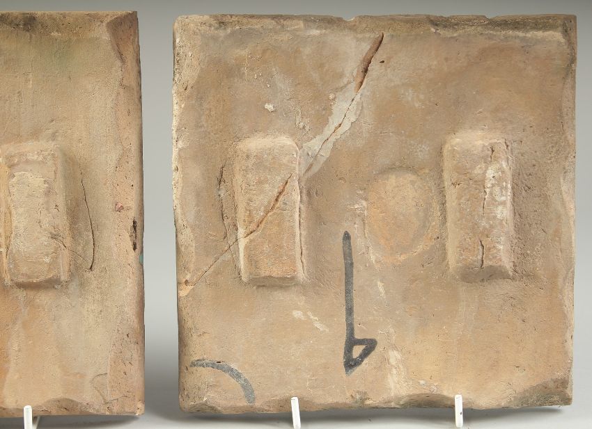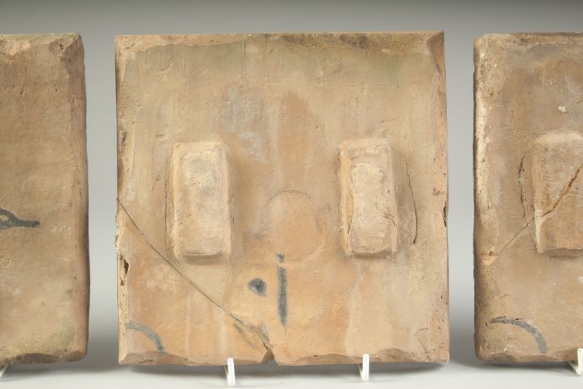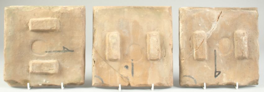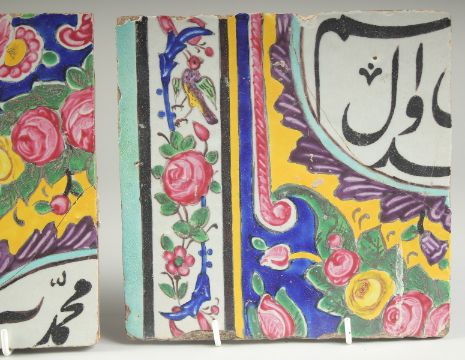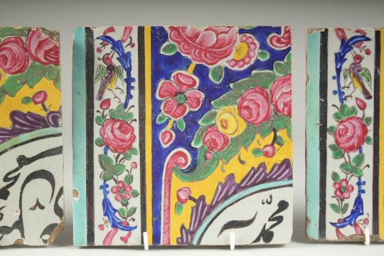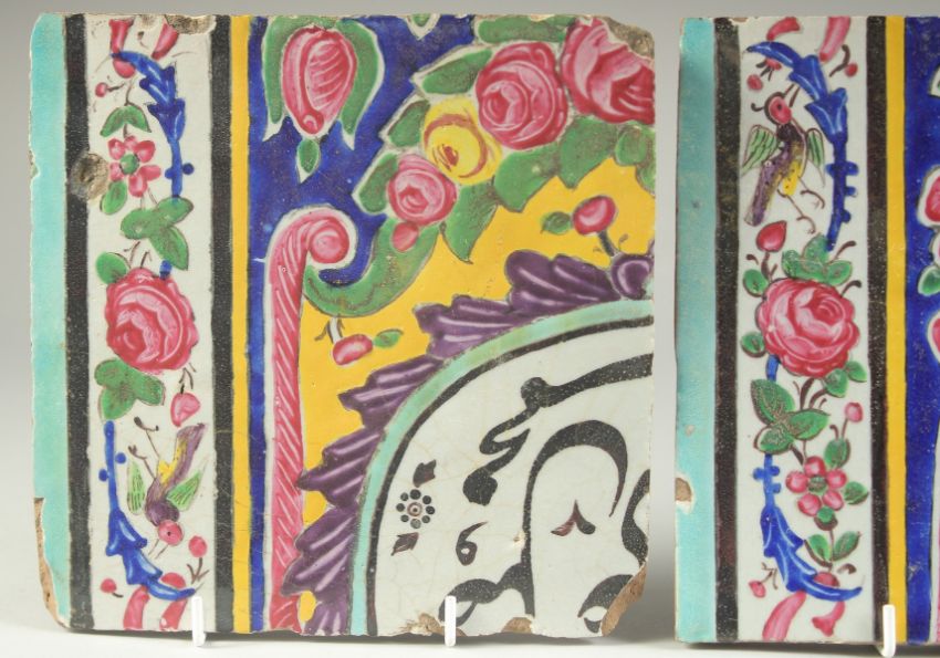 A COLLECTION OF THREE 19TH CENTURY PERSIAN QAJAR GLAZED POTTERY TILES, painted with calligraphy, birds and flora, 20cm x 20cm each, (3).