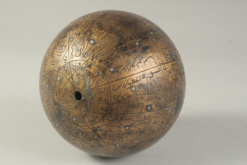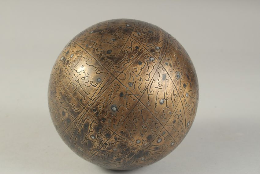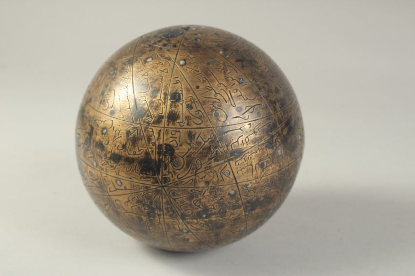 A SILVER INLAID BRASS CELESTIAL GLOBE, decorated with the 48 constellations and inscribed with their names in Arabic. Celestial globes show the heavens from above. Individual stars are marked by inlaid silver dots, while engraved figures represent the 48 constellations inherited from Greek and Roman astronomy, approx. 15cm wide.
