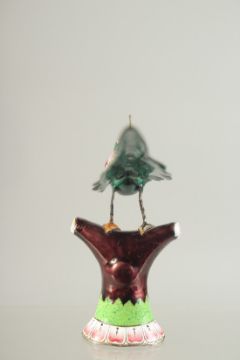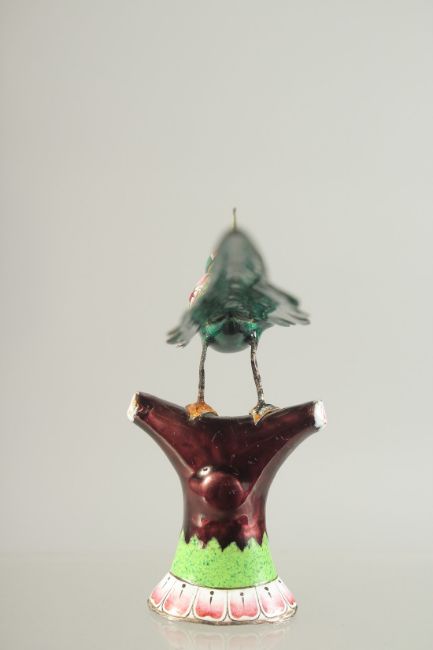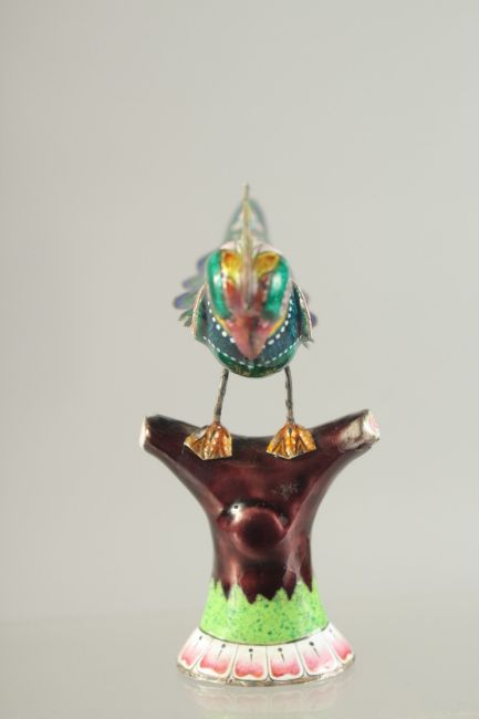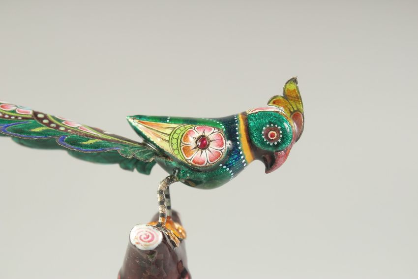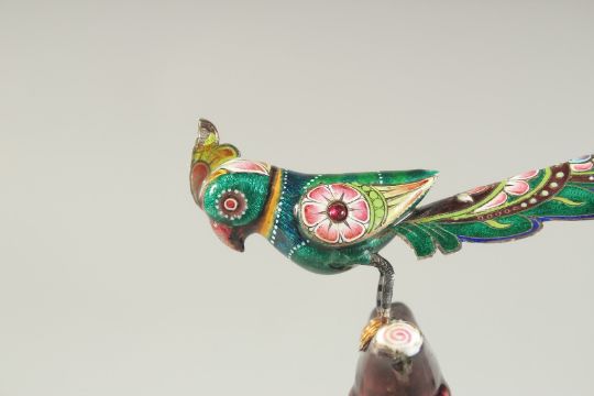 A FINE EARLY 20TH CENTURY INDIAN ENAMELLED SILVER PARROT, inlaid with small rubies, 14cm long.