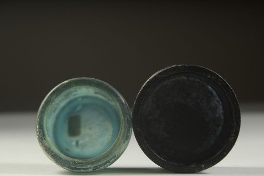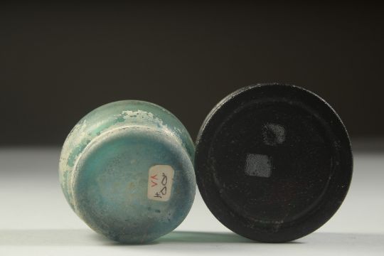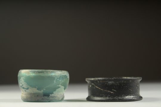 TWO ANCIENT PERSIAN OR POSSIBLY ROMAN GLASS BOWLS, 6cm and 5cm diameter, (2).