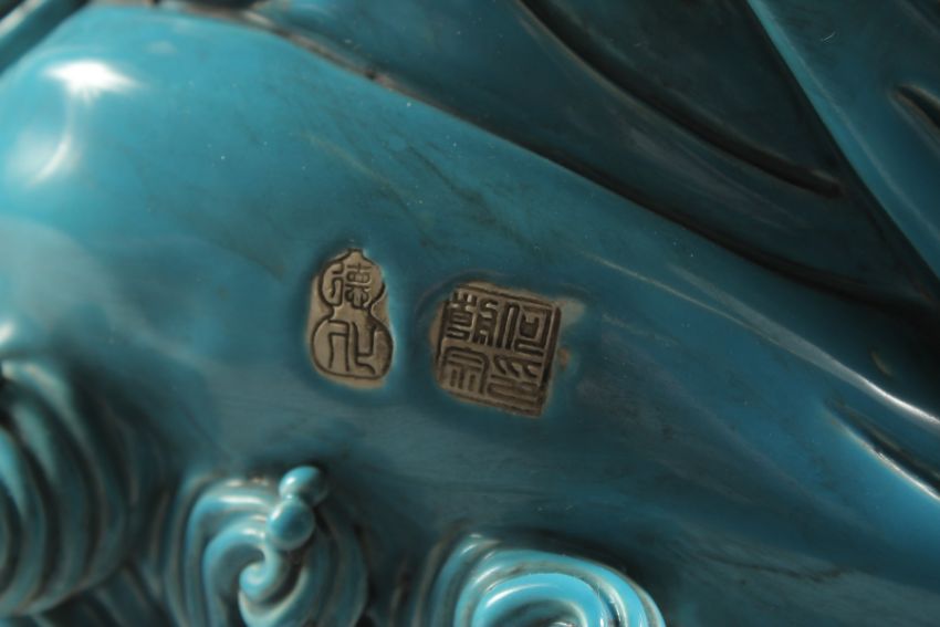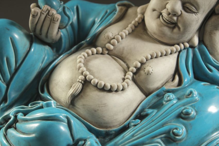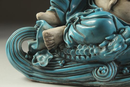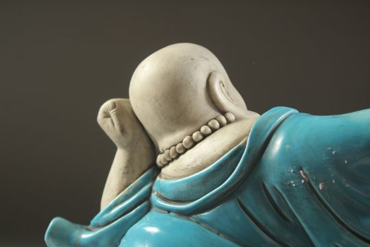A LARGE TURQUOISE GLAZED POTTERY HAPPY BUDDHA, in reclining position with coiled dragon at his feet, 39cm wide.
