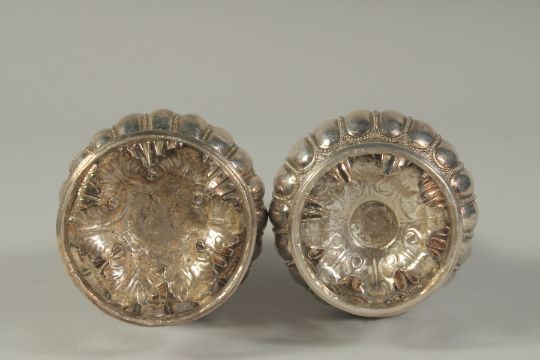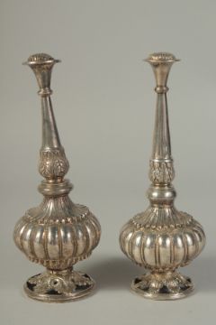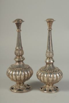 A FINE PAIR OF SILVER ROSEWATER SPRINKLERS, with lobed floral body, the spout-heads engraved as flower heads, 17cm high.