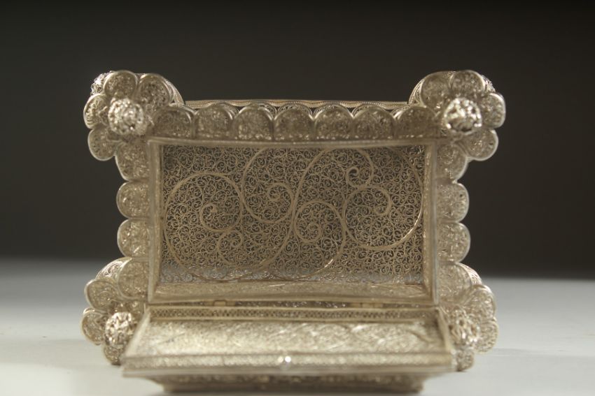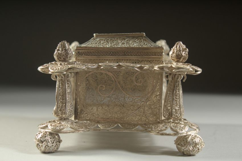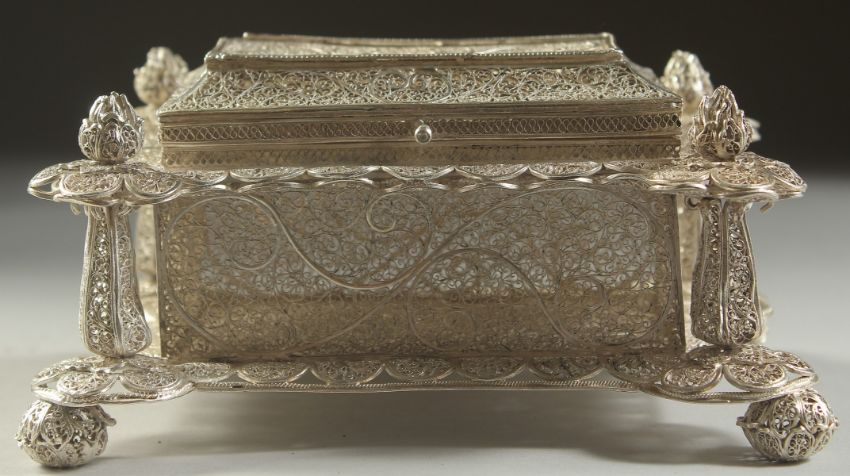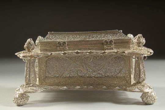 A VERY FINE AND RARE CIRCA 1700 INDO PORTUGESE POSSIBLY GOA FILIGREE SILVER CASKET, the four corners pillars with torch-like finials, supported on ball feet, base 16cm x 11cm, 8cm high.