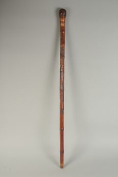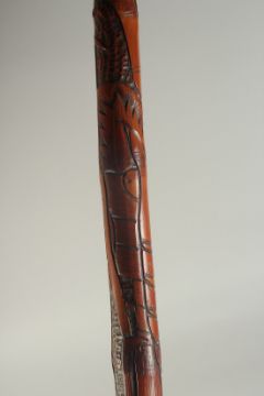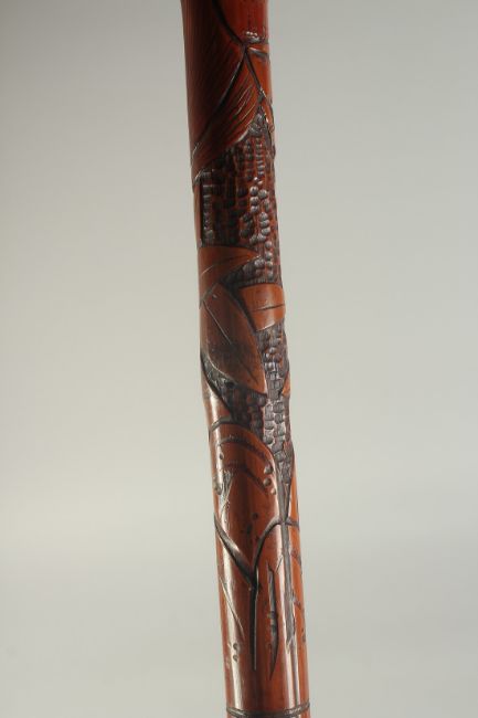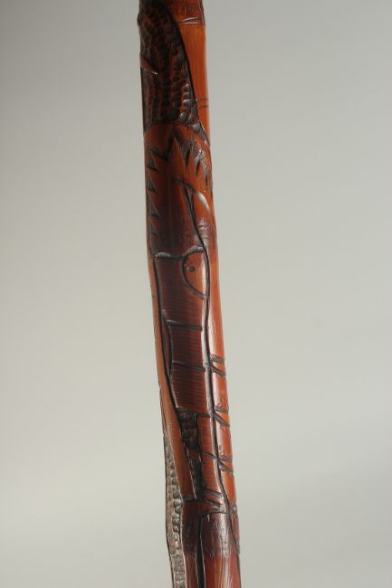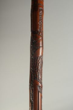 A CHINESE BAMBOO WALKING STICK, carved with a dragon or serpent, 88cm long.