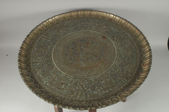 AN ISLAMIC ENGRAVED BRASS TRAY TABLE, with folding bone inlaid wooden legs, tray 66cm diameter.