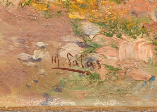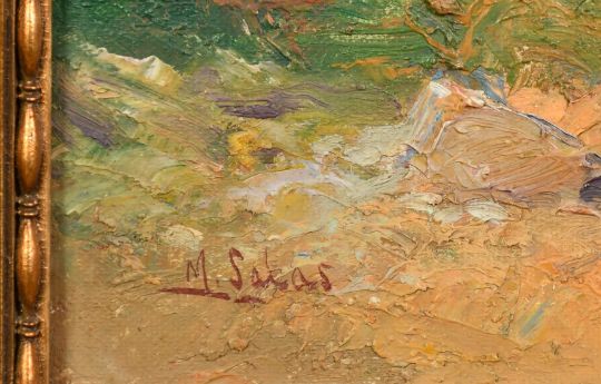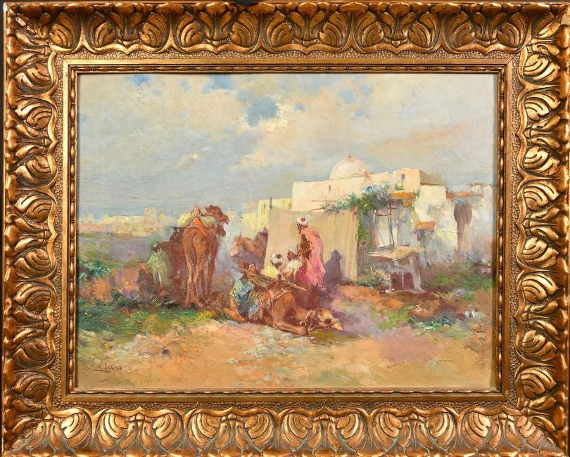 MANUEL MENSA SALAS (1875-1938) SPANISH, a pair of oil on board paintings of North African figures and horses gathered beside buildings with city views beyond, both signed, each 14.5" x 19" (37 x 48cm), (2).