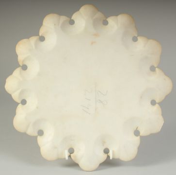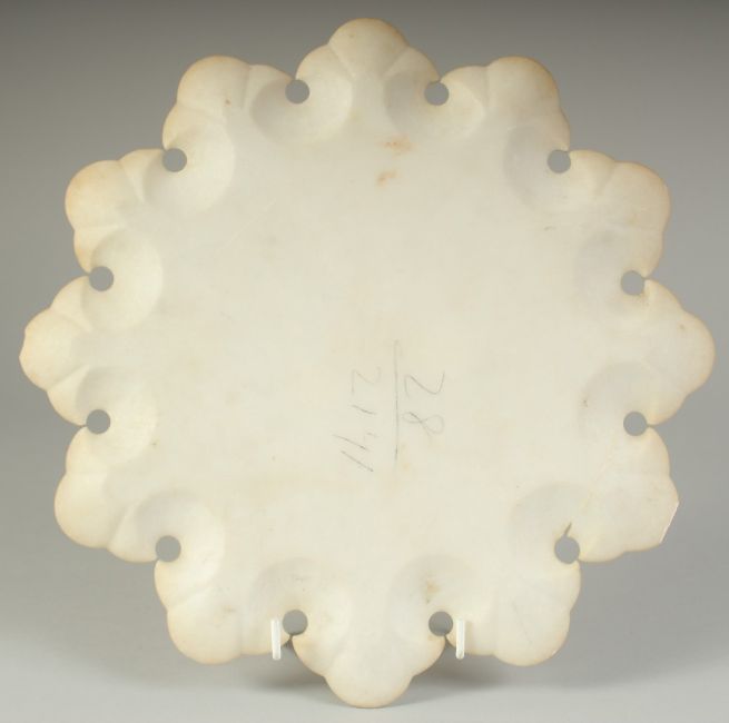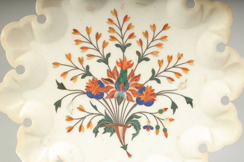 A VERY FINE 19TH-EARLY 20TH CENTURY NORTH INDIAN AGRA PIETRA DURA INLAID MARBLE DISH, with lapis, malachite, agate, jade, topaz, and mother of pearl, 30cm wide.