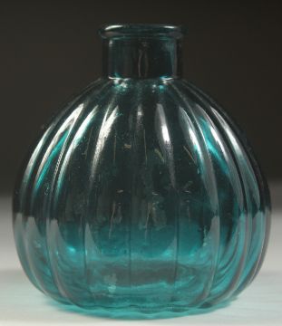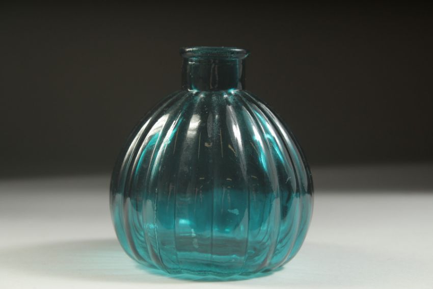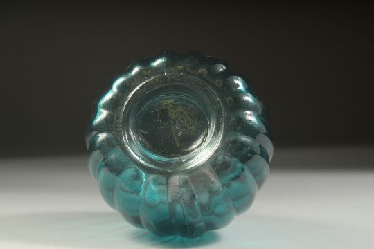 A FINE POSSIBLY MUGHAL INDIAN BLUE GLASS LOBED BOTTLE - POSSBLY A HUQQA BASE, 9.5cm high.