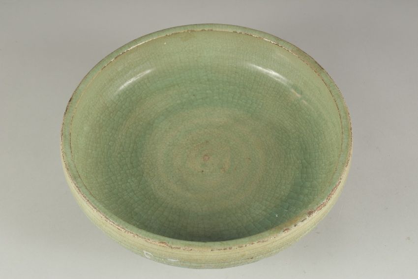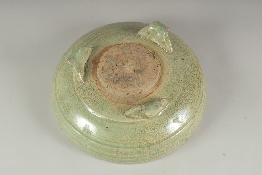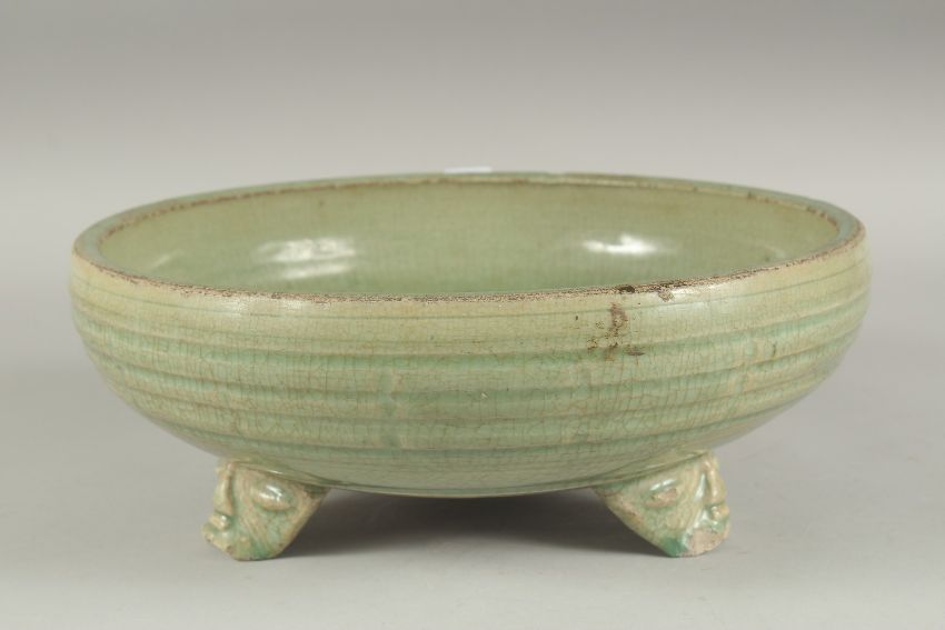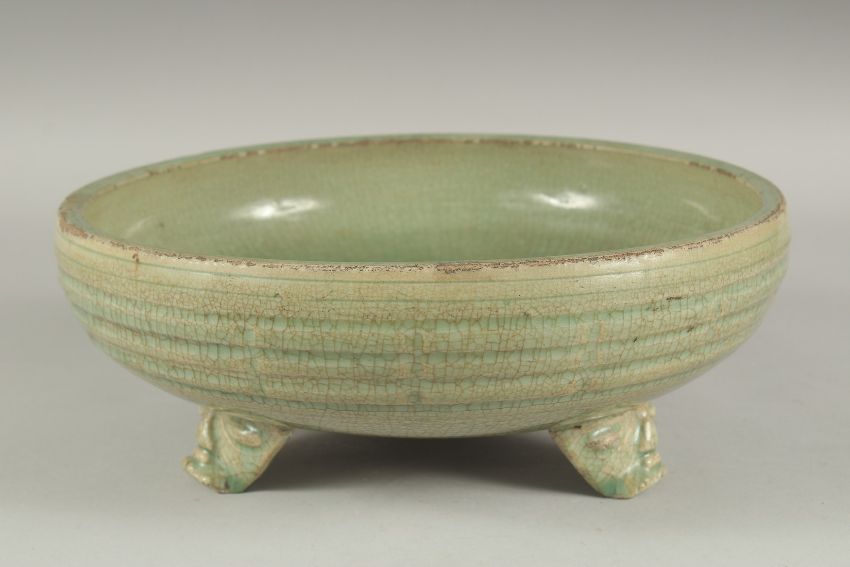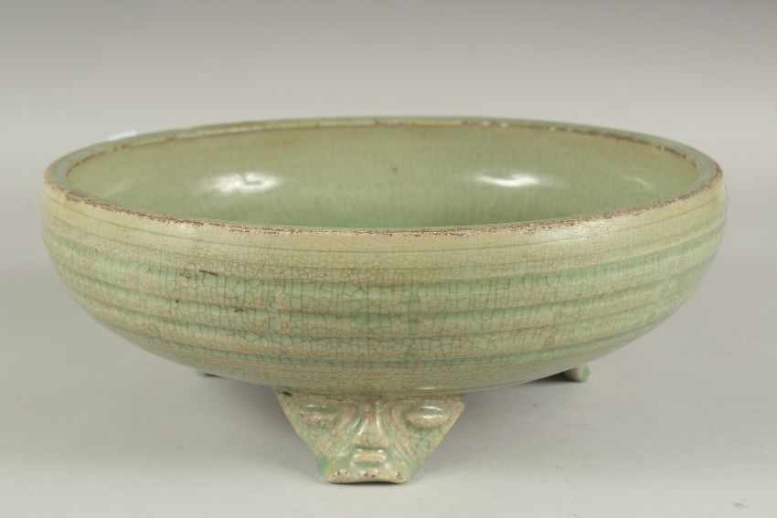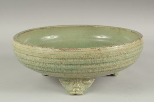 A LARGE CHINESE CELADON GLAZE CIRCULAR CENSER, raised on three moulded legs, 30cm diameter.