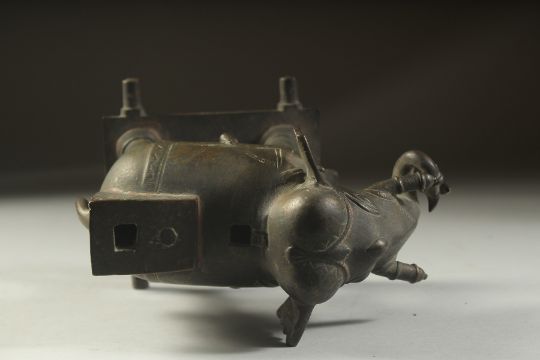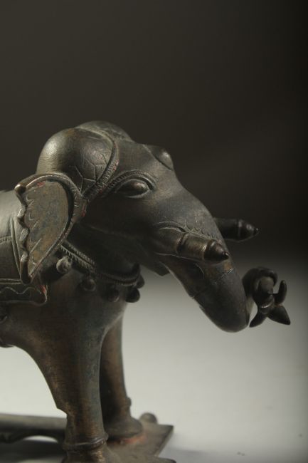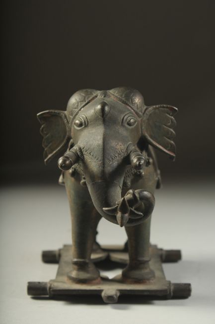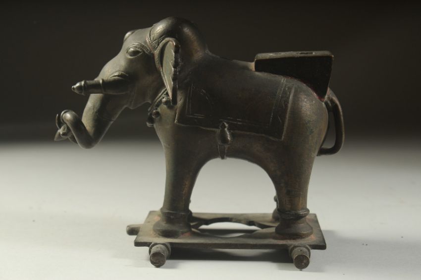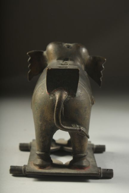 A FINE 18TH CENTURY SOUTH INDIAN BRONZE ELEPHANT, with traces red figment, 17cm long.