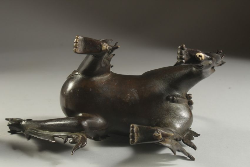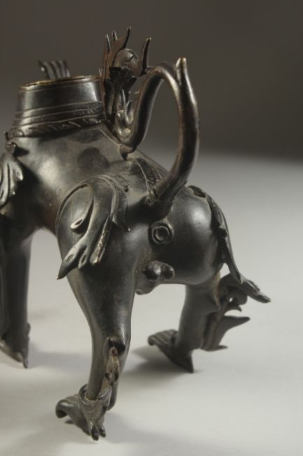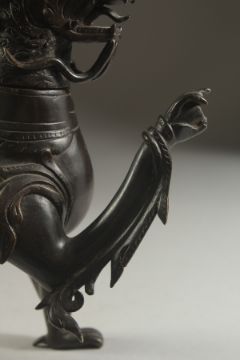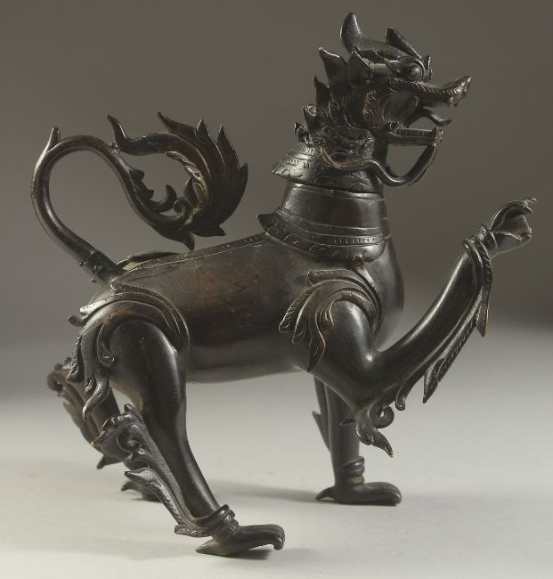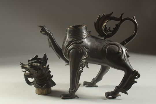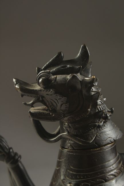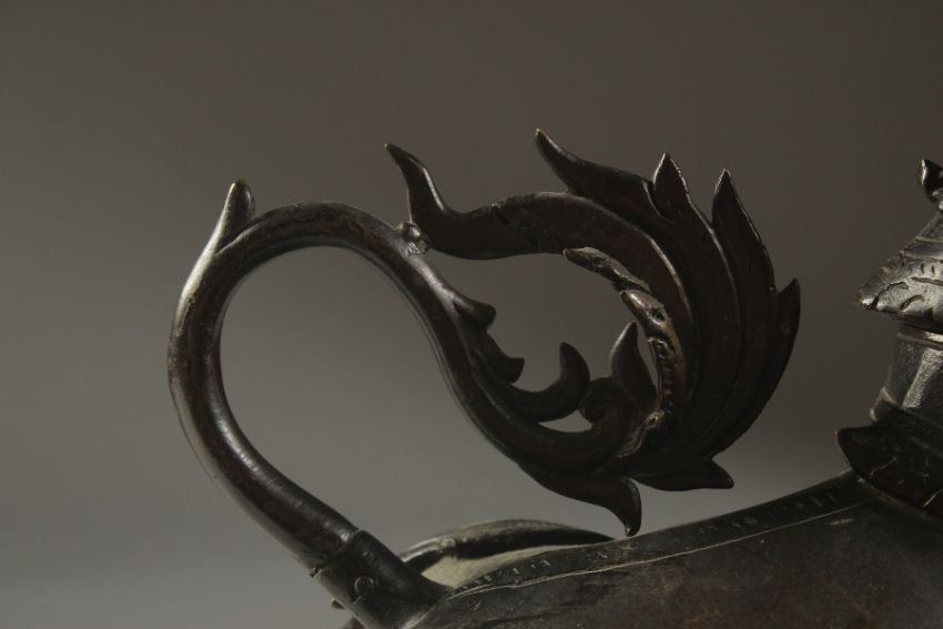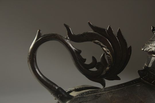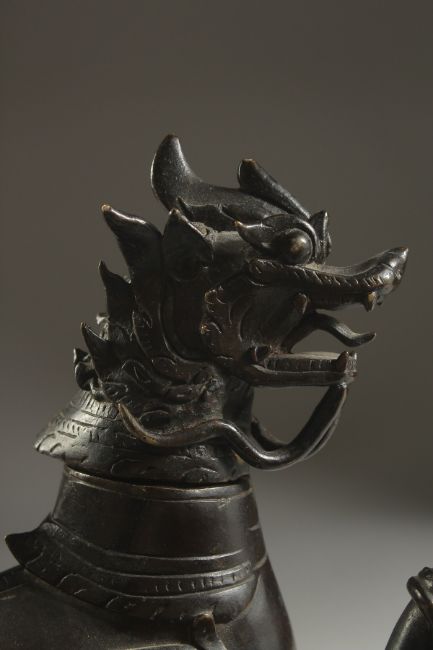 A VERY FINE AND RARE POSSIBLY INDIAN DECCANI BRONZE DRAGON SHAPED AQUAMANIAL EWER, with removable head, ewer pours from the raised claw, 26cm high.