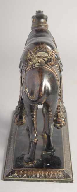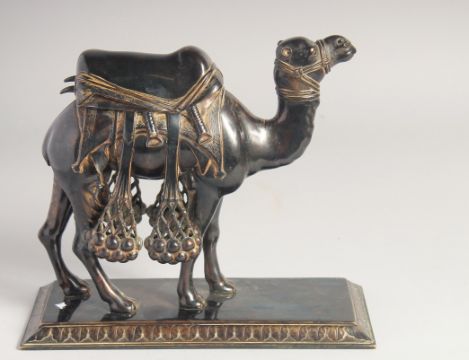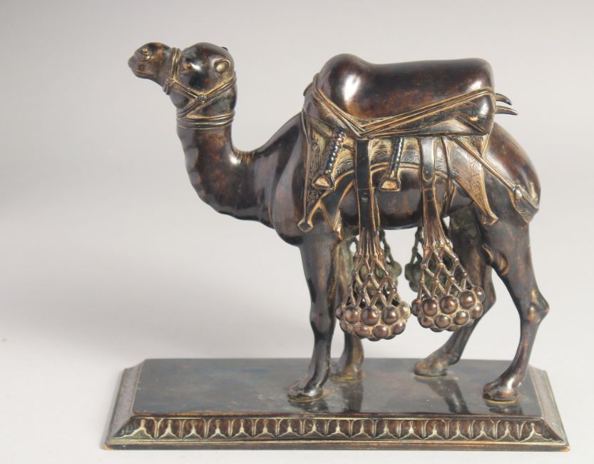A VERY FINE 19TH CENTURY INDIAN BRONZE CAMEL, mounted to a rectangular stand. Stand 23cm x 9.5cm