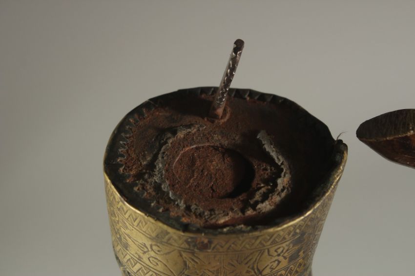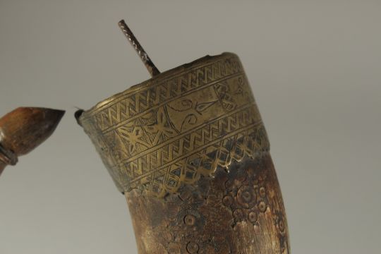 AN 18TH CENTURY MUGHAL INDIAN BRASS MOUNTED CARVED HORN POWDER FLASK, 17cm high.