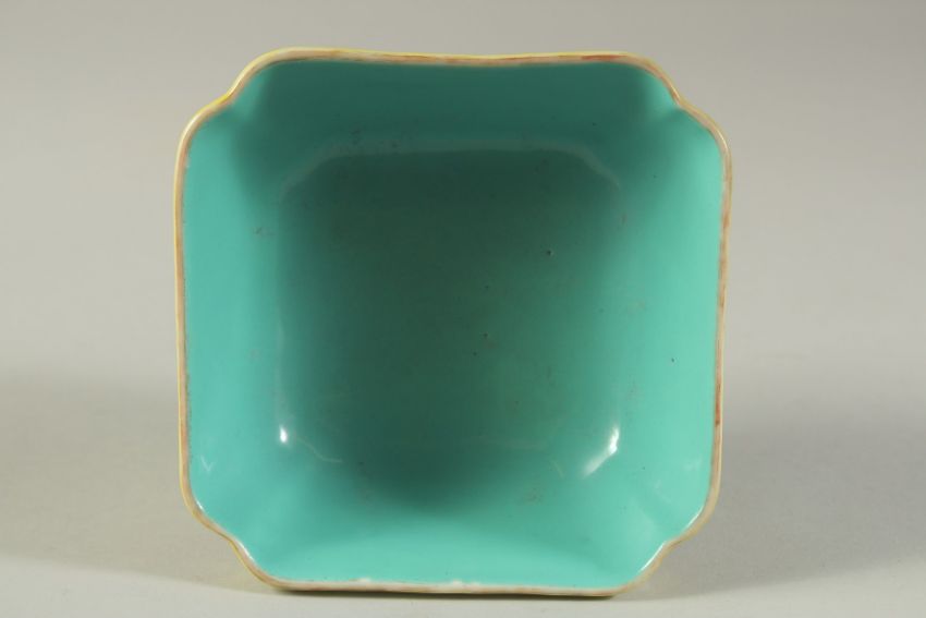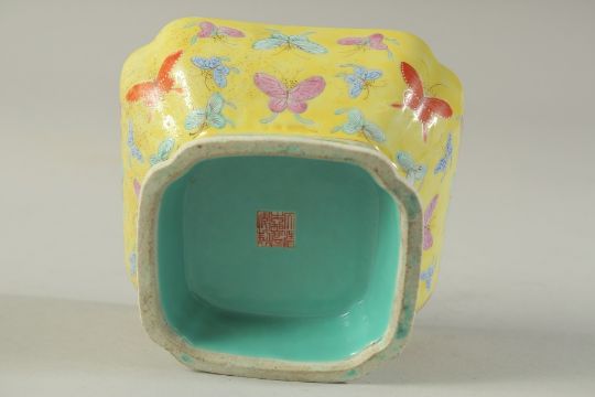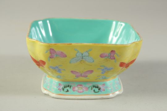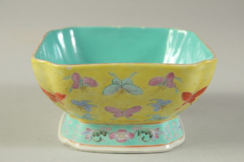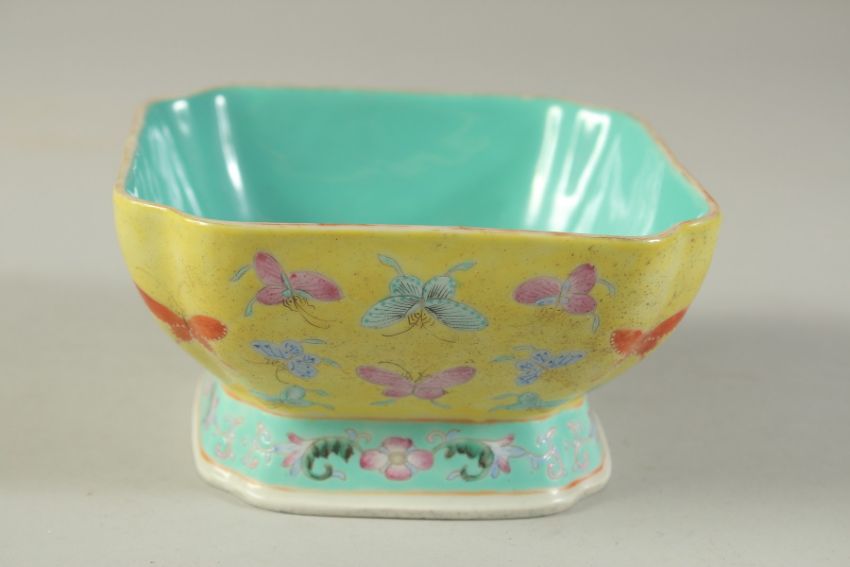 A CHINESE FAMILLE JAUNE PORCELAIN SQUARE-FORM BUTTERFLY BOWL, the base with Jiaqing mark, 15cm at widest point.