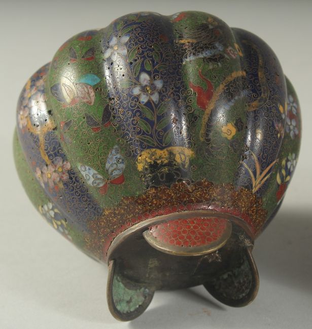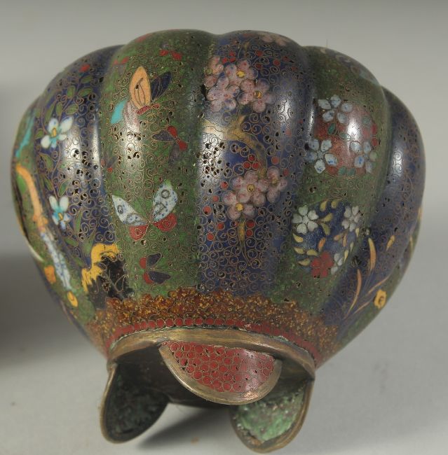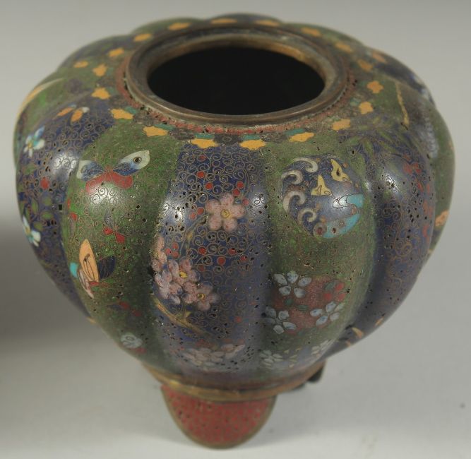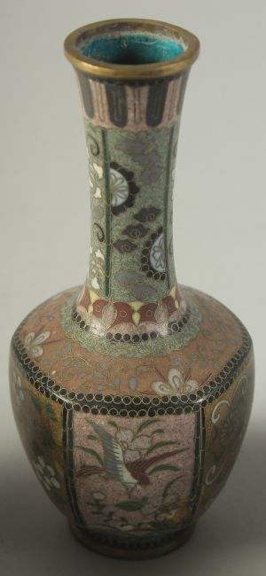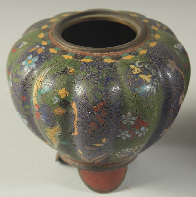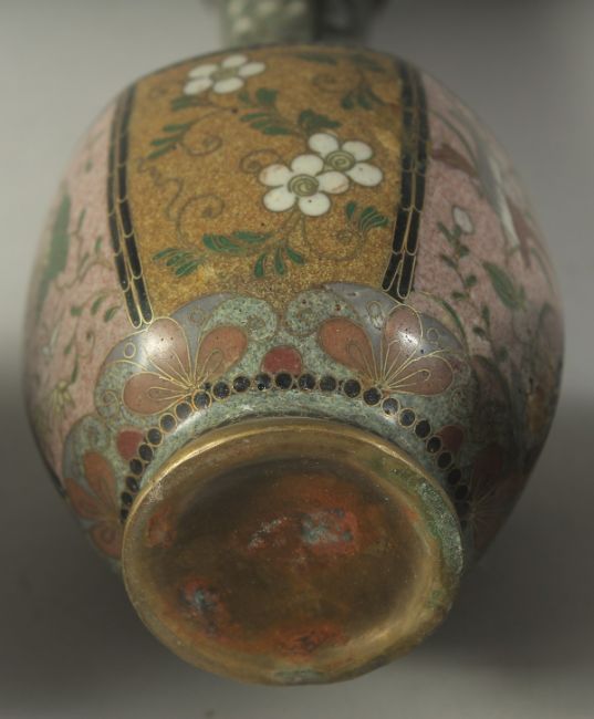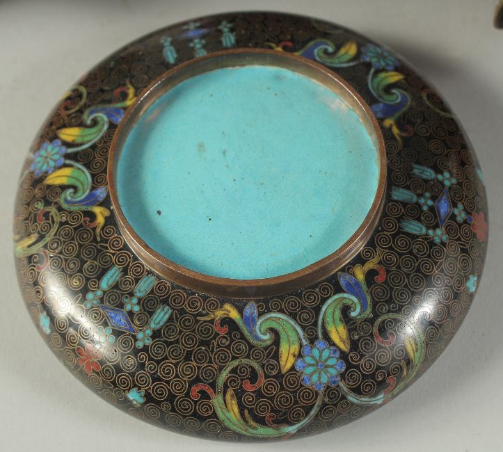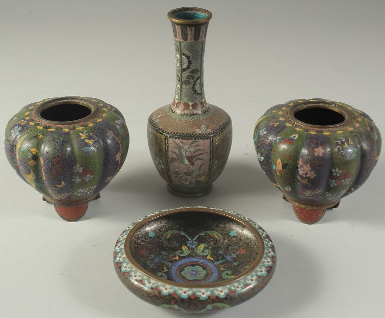 FOUR JAPANESE CLOISONNE ITEMS; comprising a small circular dish, a small bottle vase, and a pair of jars (lacking lids), (4).