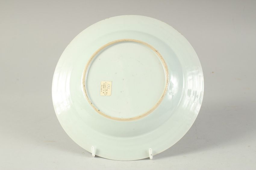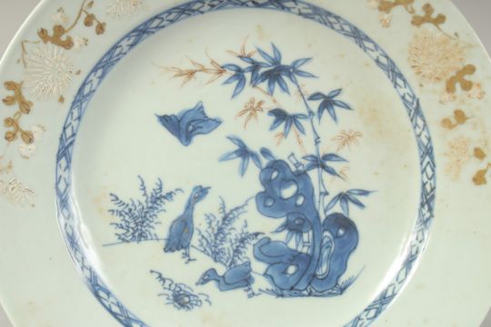 A 19TH CENTURY CHINESE GILT DECORATED BLUE AND WHITE PORCELAIN PLATE, with enamel painted flowers with gilt leaves and central panel depicting birds and bamboo, 23cm diameter.