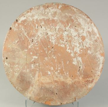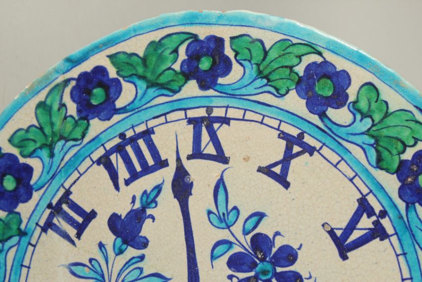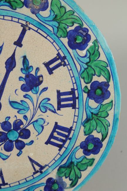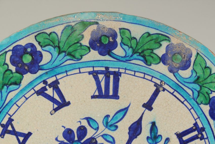 A VERY UNUSUAL LARGE 19TH CENTURY NORTH INDIAN MULTAN GLAZED POTTERY CLOCK FACE TILE, made for the European market, with foliate border, 34cm diameter.