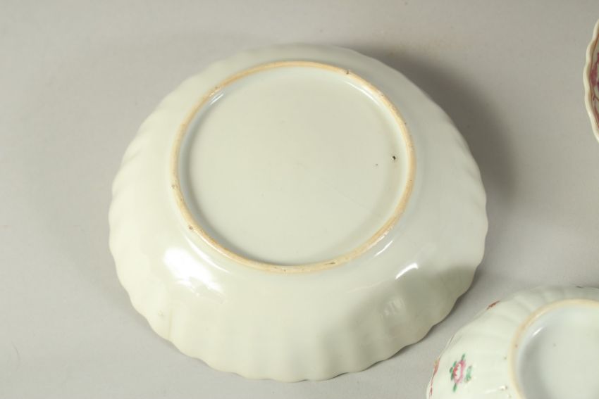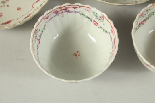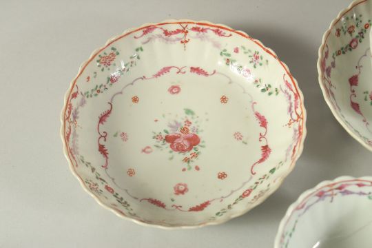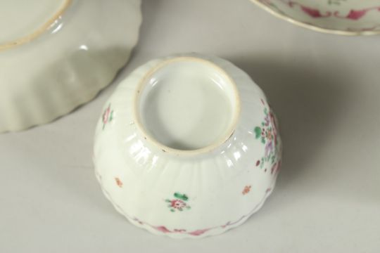 A SET OF THREE CHINESE FAMILLE ROSE PORCELAIN TEA BOWLS AND SAUCERS, (some faults), (x6 pieces).