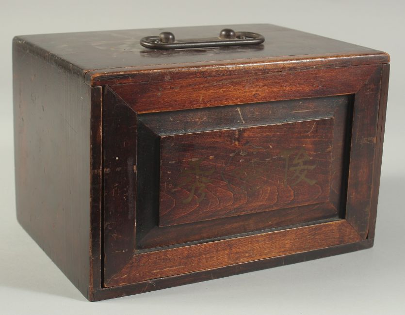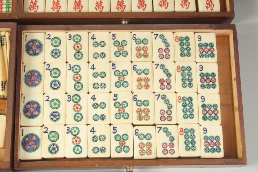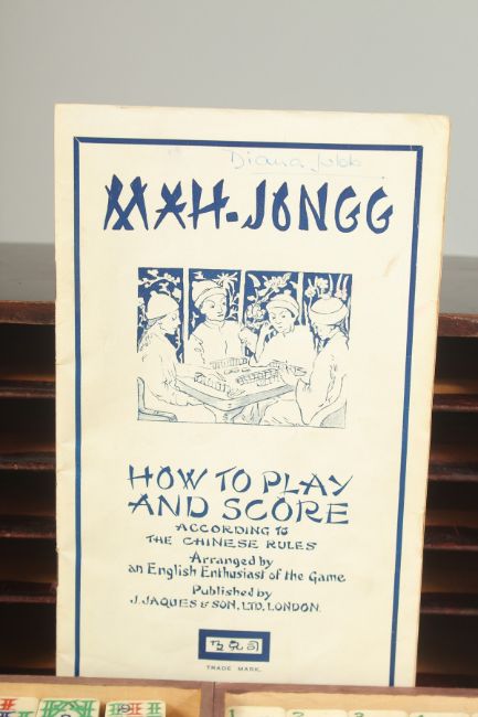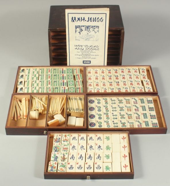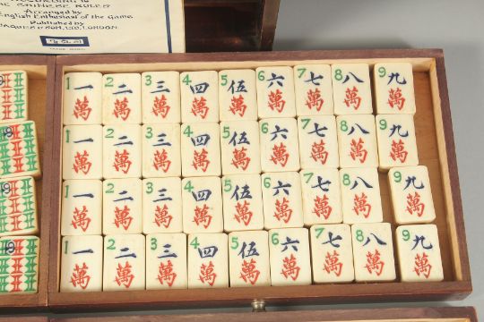 A CHINESE BOXED MAHJONG SET, with bone gaming counters inside five opening drawers.