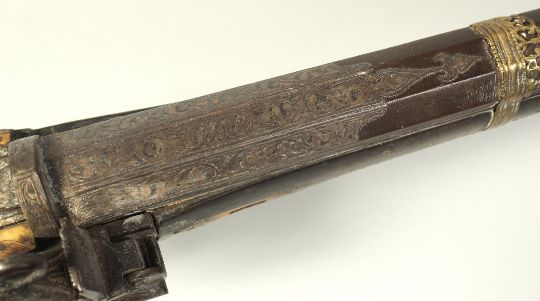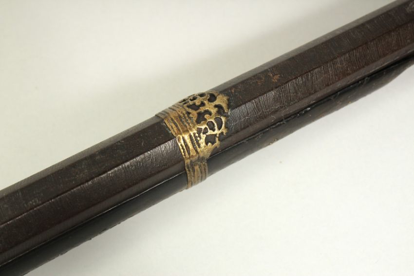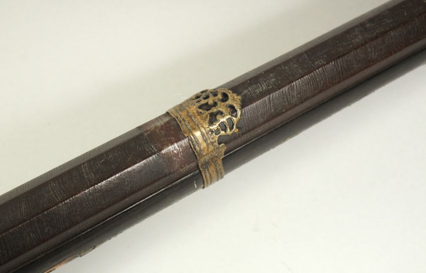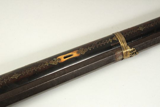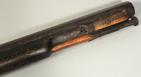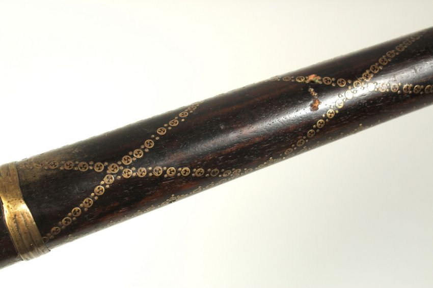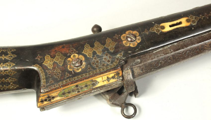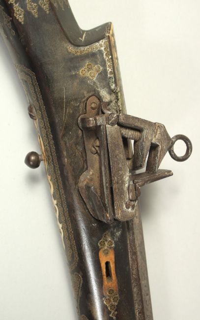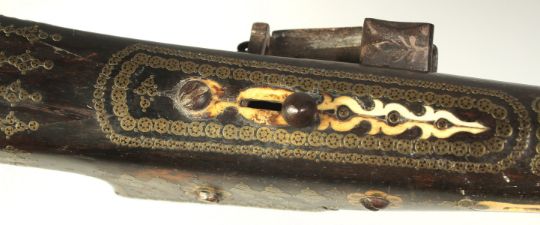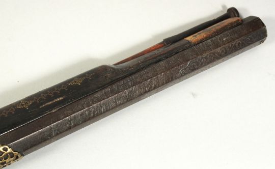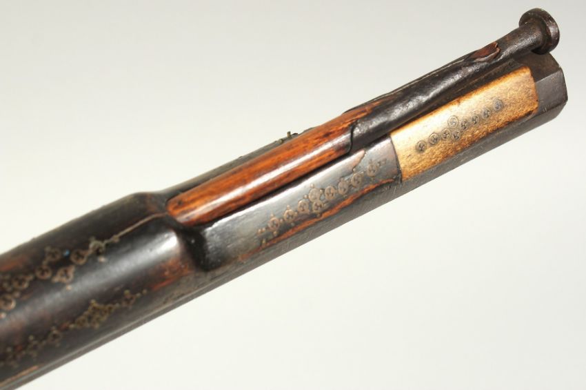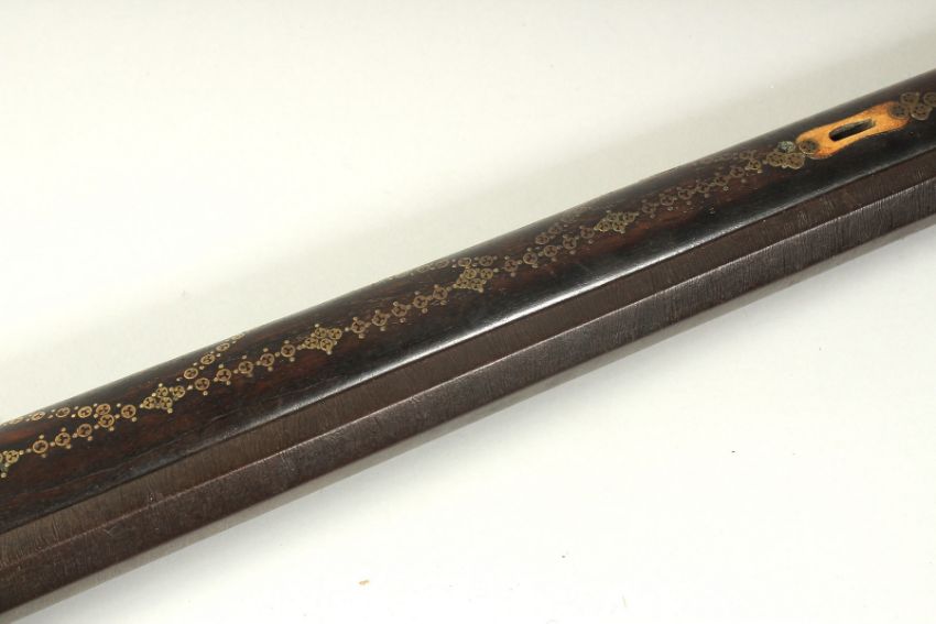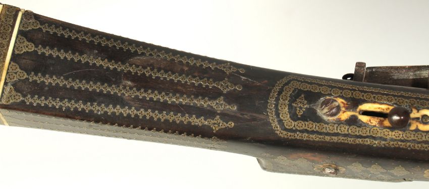 AN 18TH CENTURY OTTOMAN TURKISH FLINTLOCK RIFLE, with octagonal damascus barrel, decorative brass inlaid stock and foregrip, with bone inclusions to the stock and top of the lock plate, 123cm long.