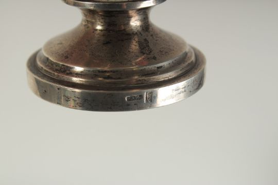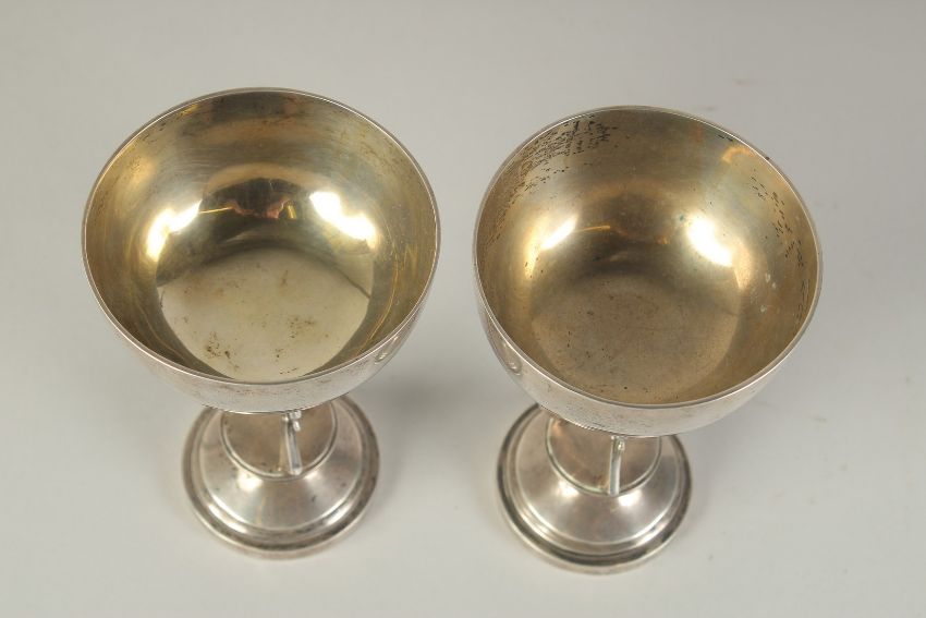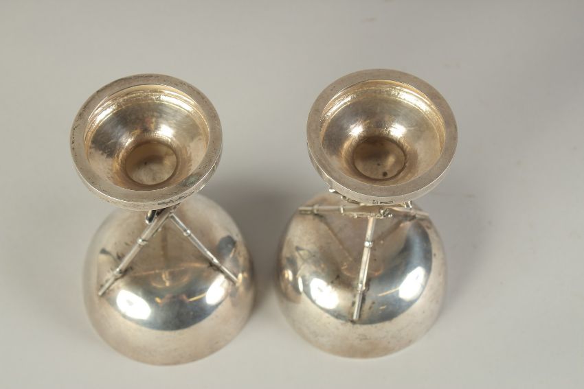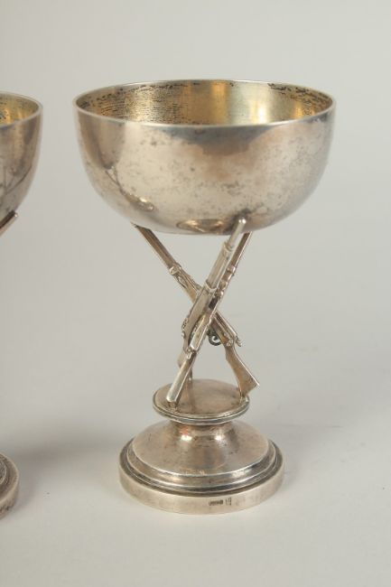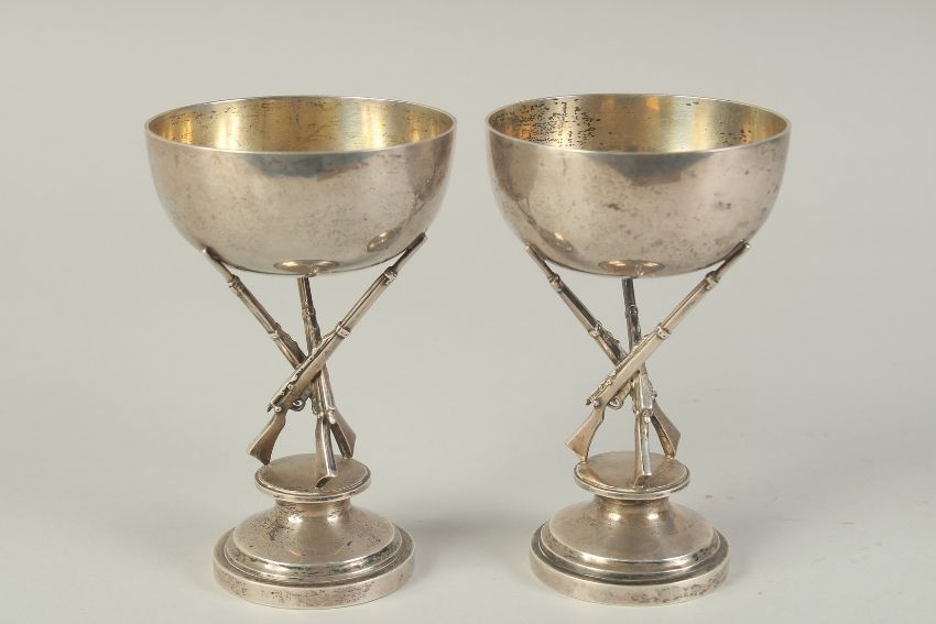 A PAIR OF CHINESE SILVER HUNTING RIFLE FOOTED CUPS, hallmarks to the foot rim, 14.5cm high.