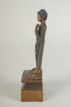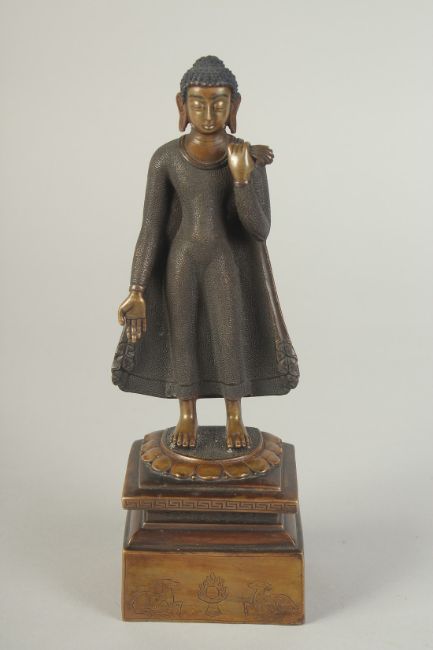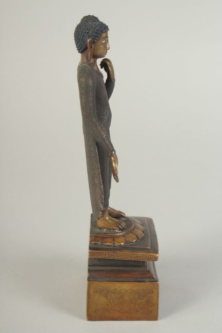 A FINELY FETTLED BRONZE STANDING BUDDHA, fitted to a lotus base plinth, 21cm high.