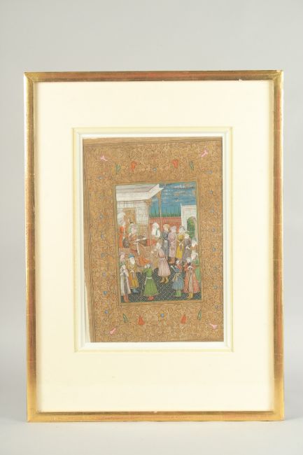 A FINE AND LARGE LATE 19TH CENTURY INDIAN MINIATURE PAINTING depicting enthroned Akbar Shah, framed and glazed, image 34cm x 23cm.