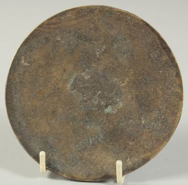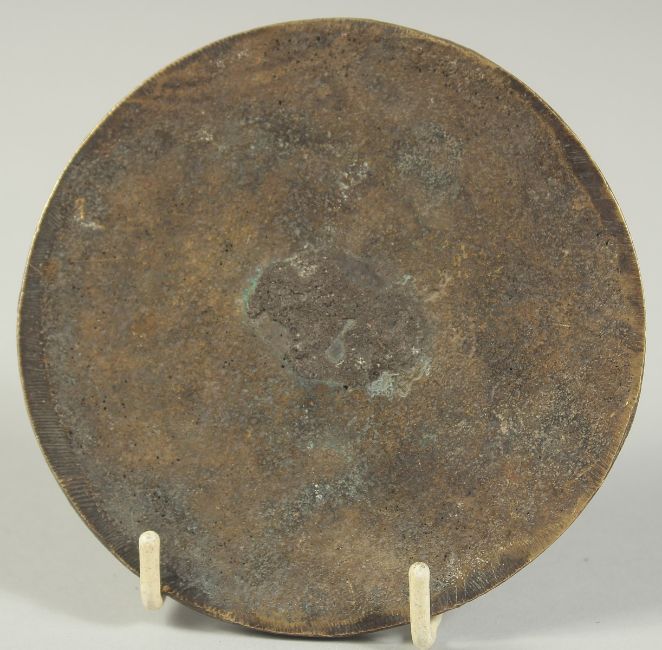 A FINE PERSIAN SELJUK BRONZE HAND MIRROR, 10cm diameter.