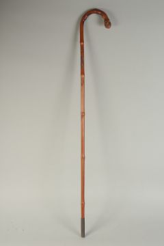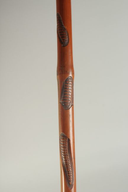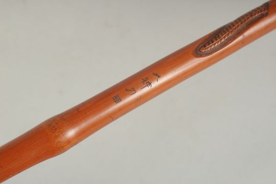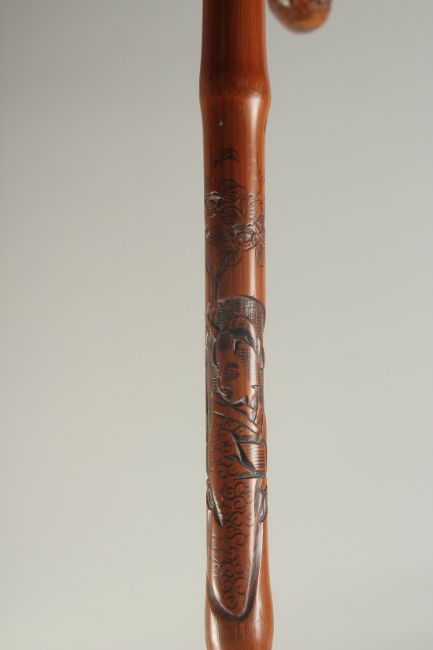 A CHINESE BAMBOO WALKING STICK, carved with female figure and serpent, inscribed /signed to lower section, 87cm long.