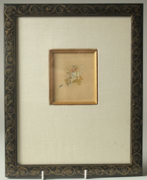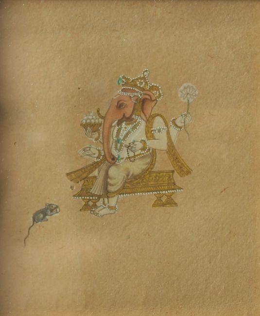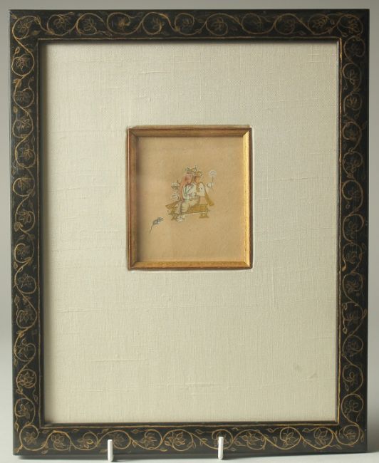 A FINE INDIAN MINIATURE PAINTING DEPICTING ENTHRONED GANESH, framed and glazed, image 9.5cm x 7.5cm.
