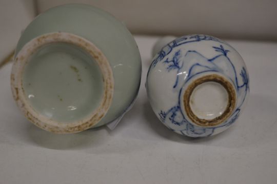 A small Chinese celadon glazed bottle vase and a small blue and white bottle vase.