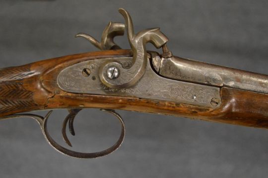 A German double barreled percussion sporting gun, 18 bore with well carved stock depicting a deer.