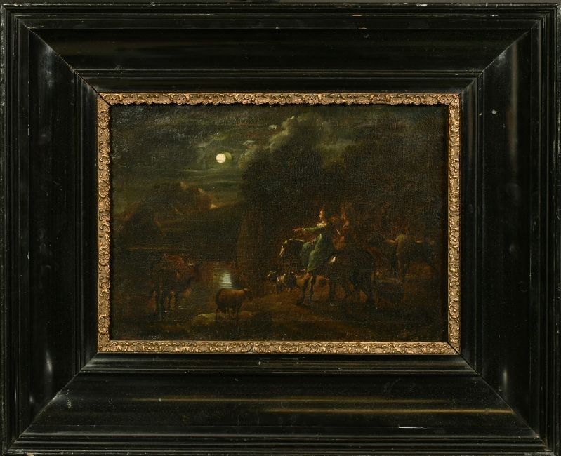 Circle of Adam Colonia, probably late 17th / Early 18th Century Dutch School, figures on horseback and livestock gathered by a river beneath moonlight, oil on canvas, remnants of a wax seal verso, 10.75" x 15.5" (27 x 39cm).