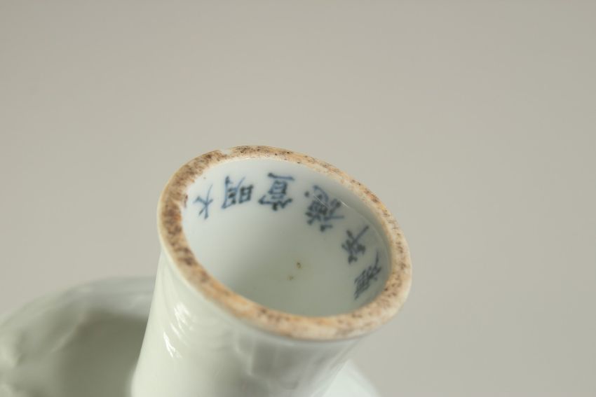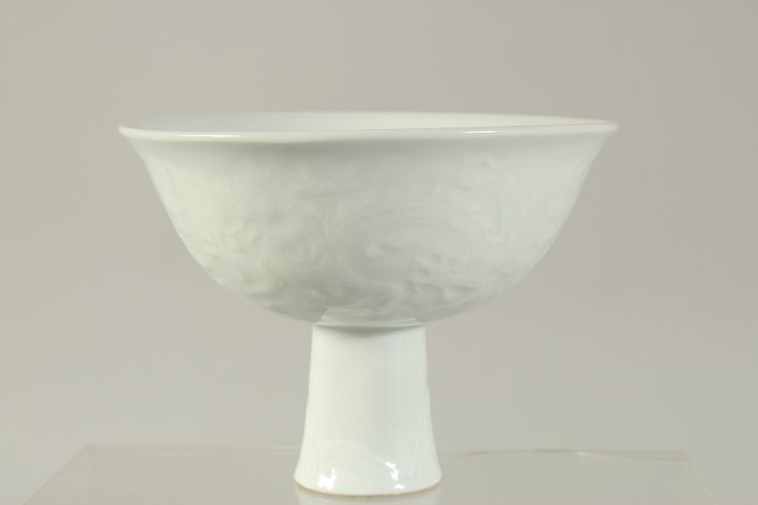 A CHINESE WHITE PORCELAIN STEM CUP with relief decoration.