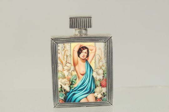 A .800 ART DECO STYLE GLAMOUR MODEL PERFUME BOTTLE.