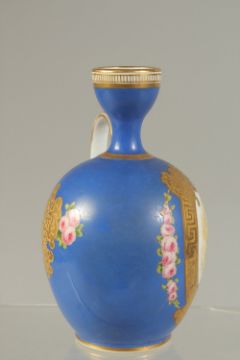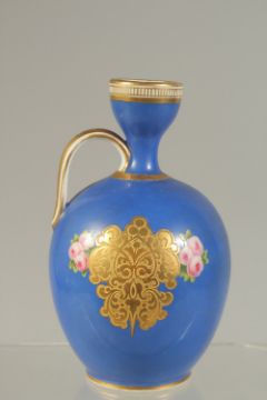 AN ENGLISH EWER, painted with a couple in a Greek key panel, on a blue ground, probably Minton.