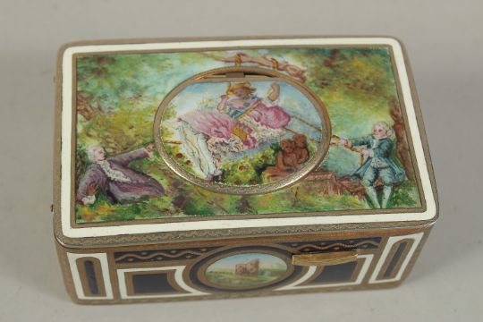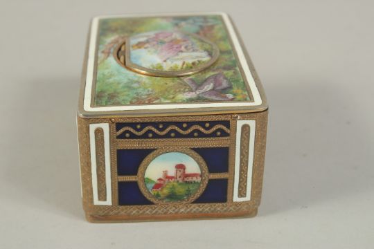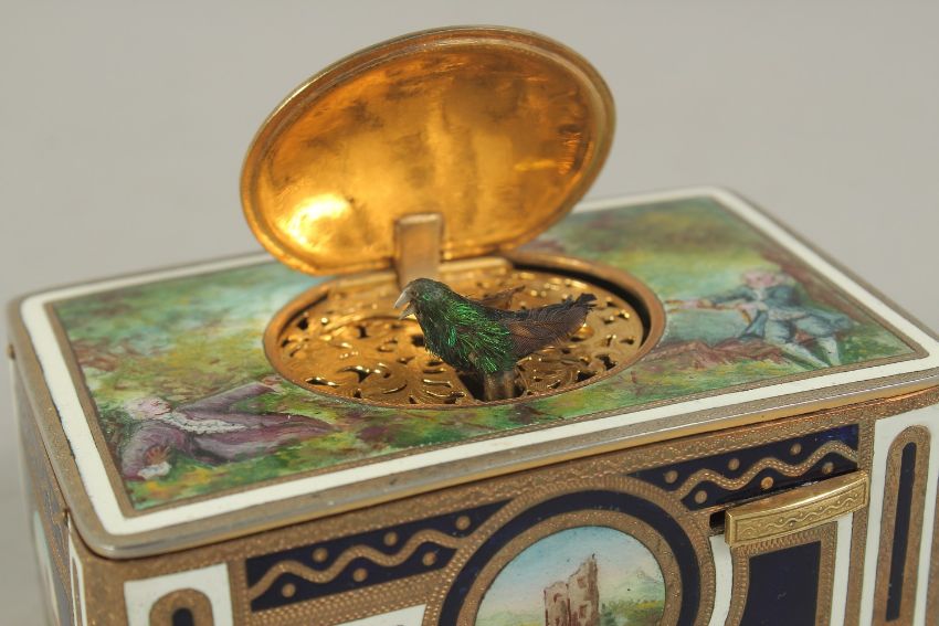 A SUPERB SINGING BIRD BOX by KARL GRIESBAUM with panels of figures and rural scenes.