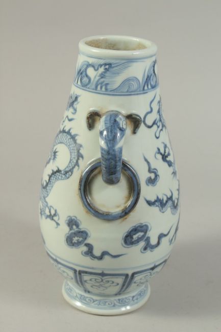 A CHINESE BLUE AND WHITE PORCELAIN TWIN-HANDLE DRAGON VASE.