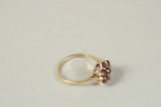 A 9CT GOLD GARNET FLOWER CLUSTER RING