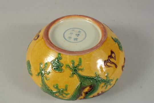 A CHINESE YELLOW GROUND CIRCULAR BOWL with dragons in relief.