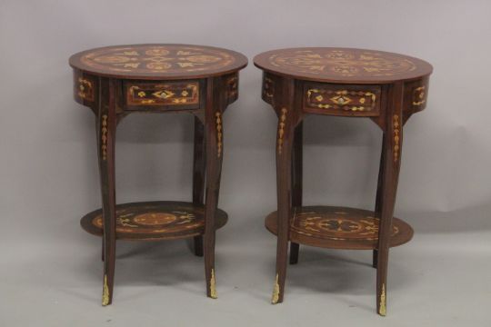 A PAIR OF LOUIS XVI DESIGN OVAL BEDSIDE TABLES.