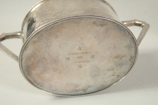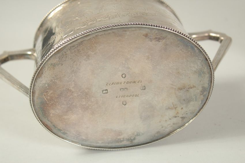A GOOD ELKINGTON & CO. OVAL SILVER TEA POT , HOT WATER JUG AND SUGAR BASIN with a Chinese design and bead edge.