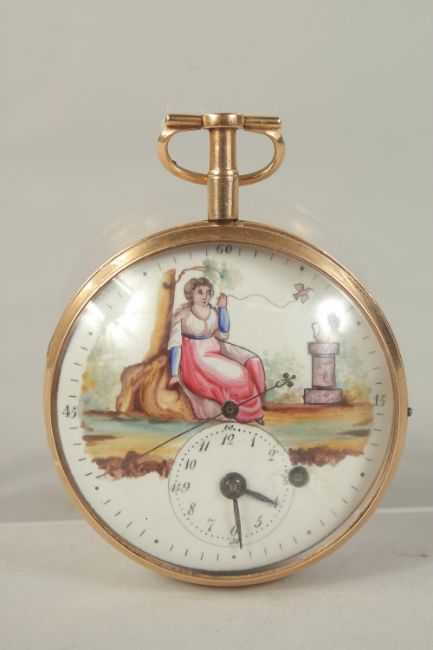 A GEORGE III 18CT GOLD OPEN FACE POCKET WATCH with enamel dial, painted with a long classical lady and urn.