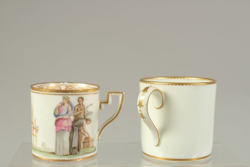 A SEVRES STYLE COFFEE CAN, painted with two children playing, incised marks near foot rim, and a Vienna type coffee can, painted with a dressing room scene with semi-clad woman.