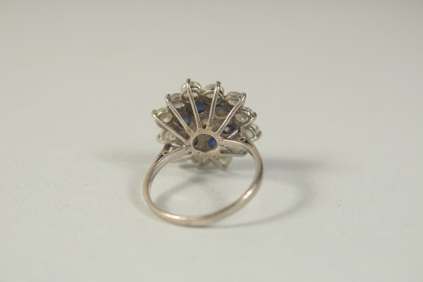 AN 18 CT WHITE GOLD DIAMOND AND SAPPHIRE CLUSTER RING.