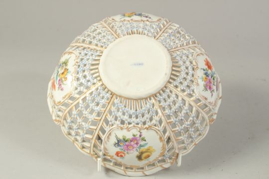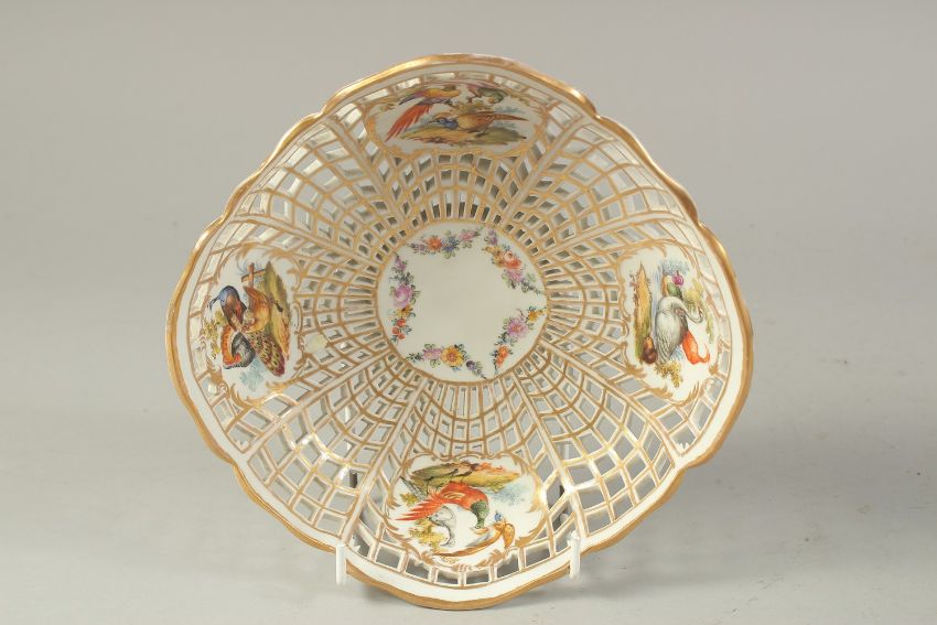 A BERLIN PIERCED WORK BASKET, with five painted panels, four with exotic birds and a fifth with swags of flowers.